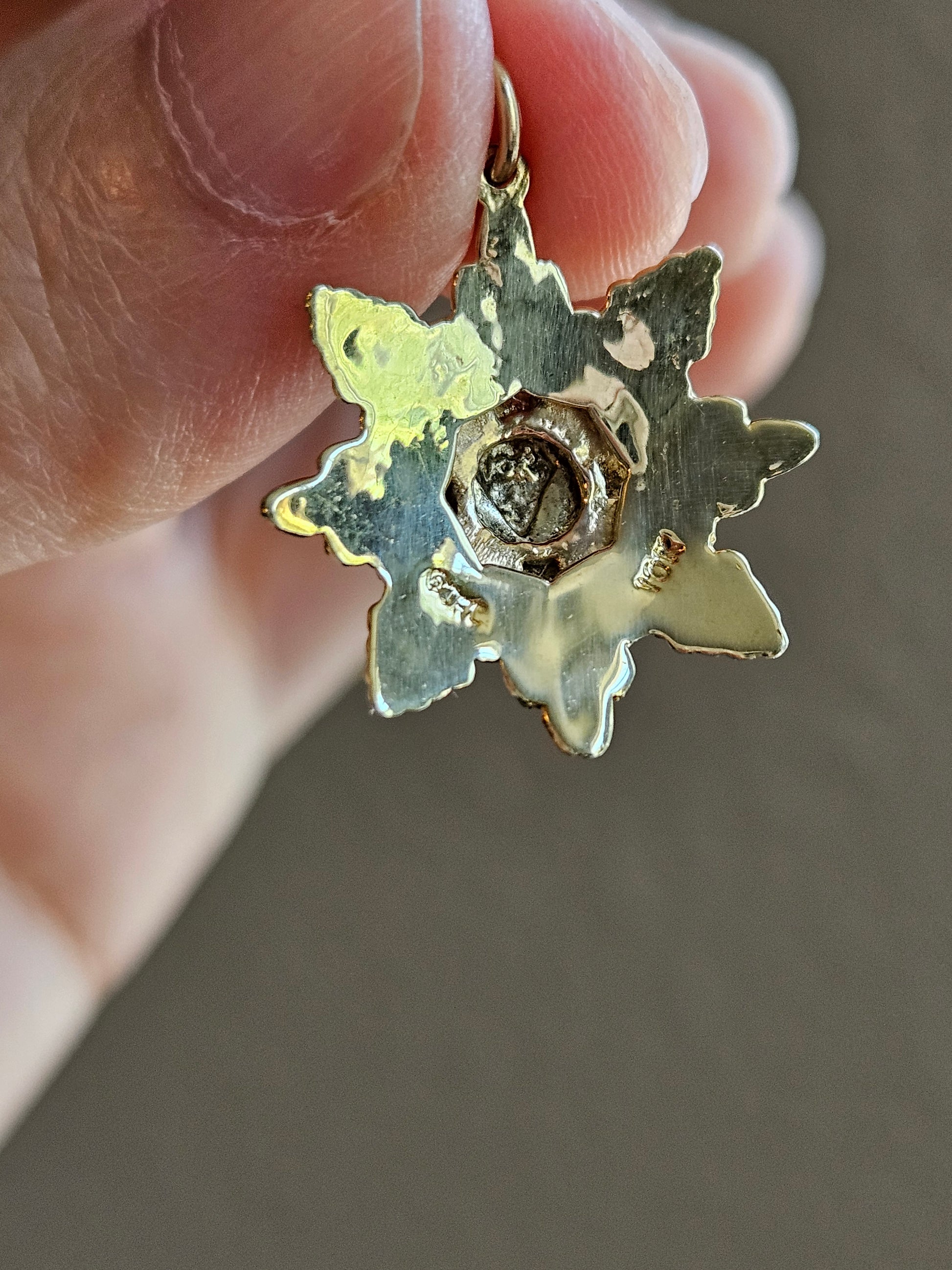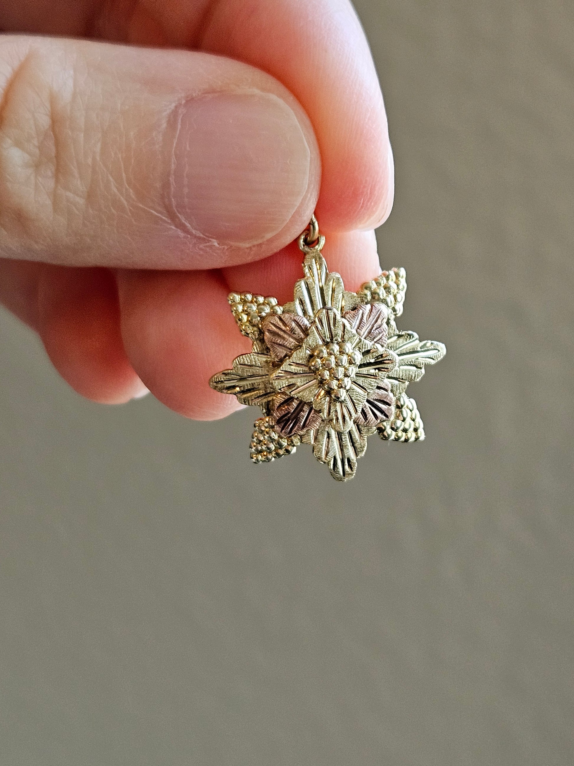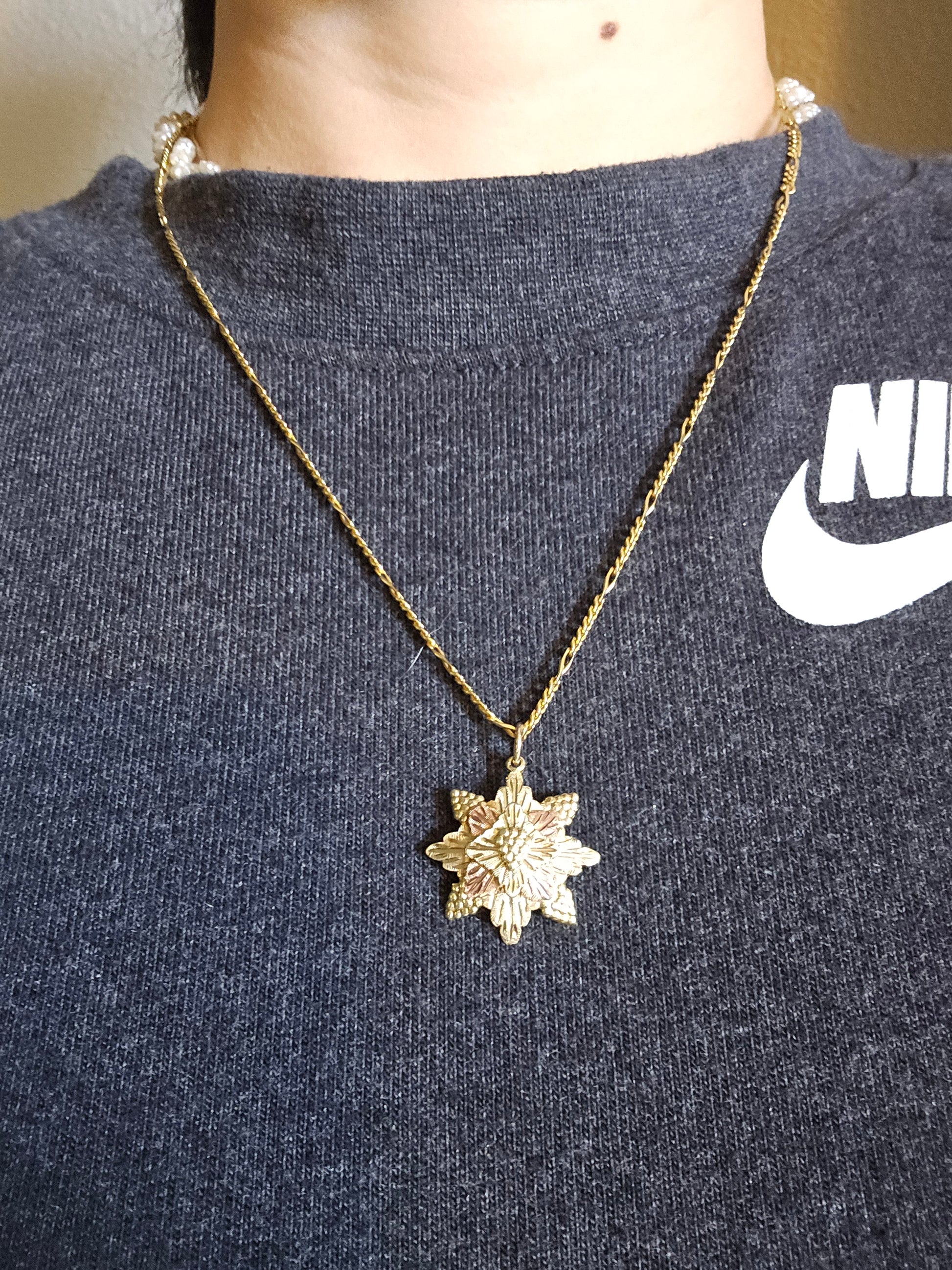 A solid gold pendant for your wine worshiper. In a rayed design with clusters of grapes. It definitely has a religious feel to them with the sunny engraved beams emulating from its center. In a delicious parchment yellow color or as the industry calls, green gold. Contrasted sharply against rose gold.